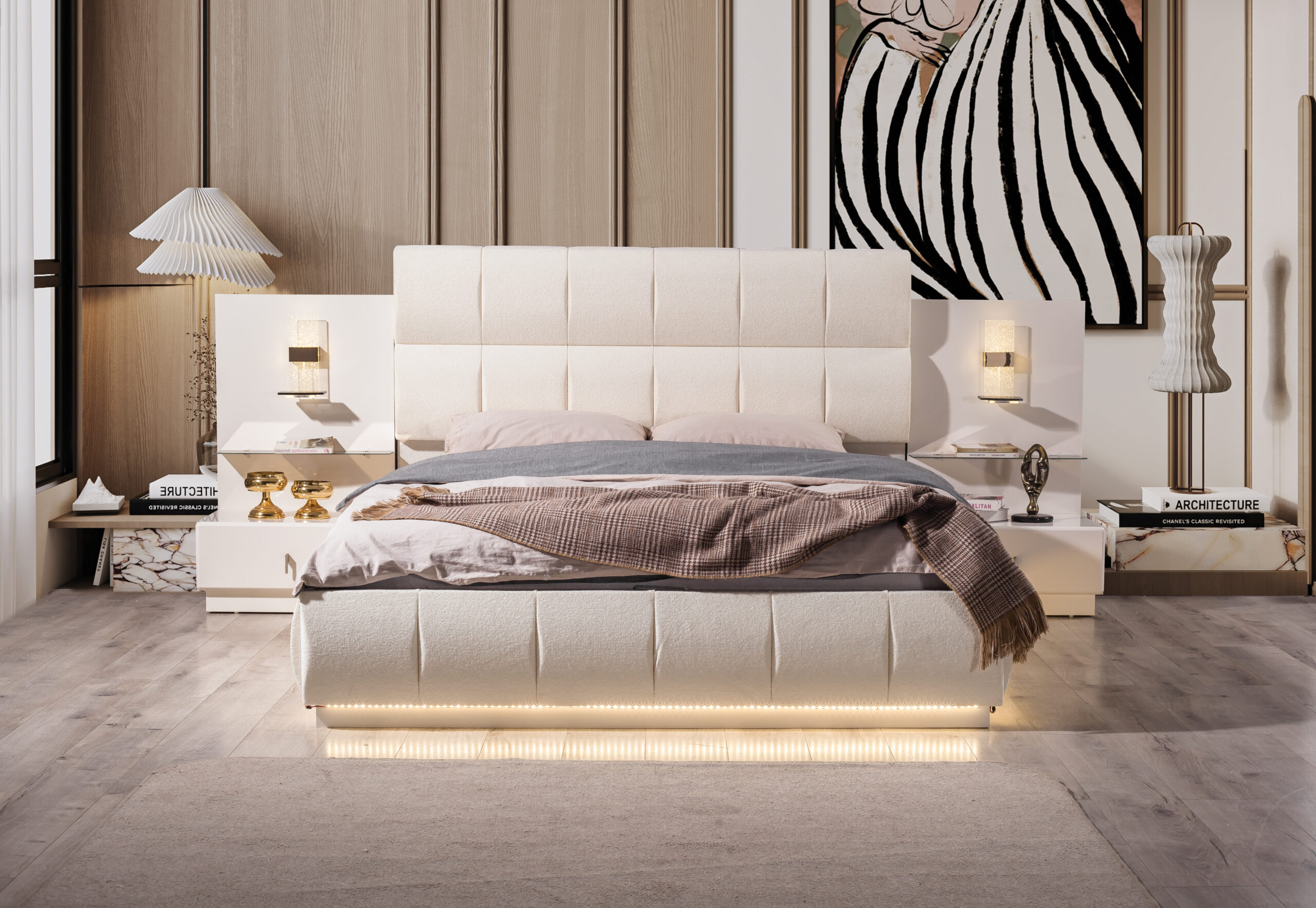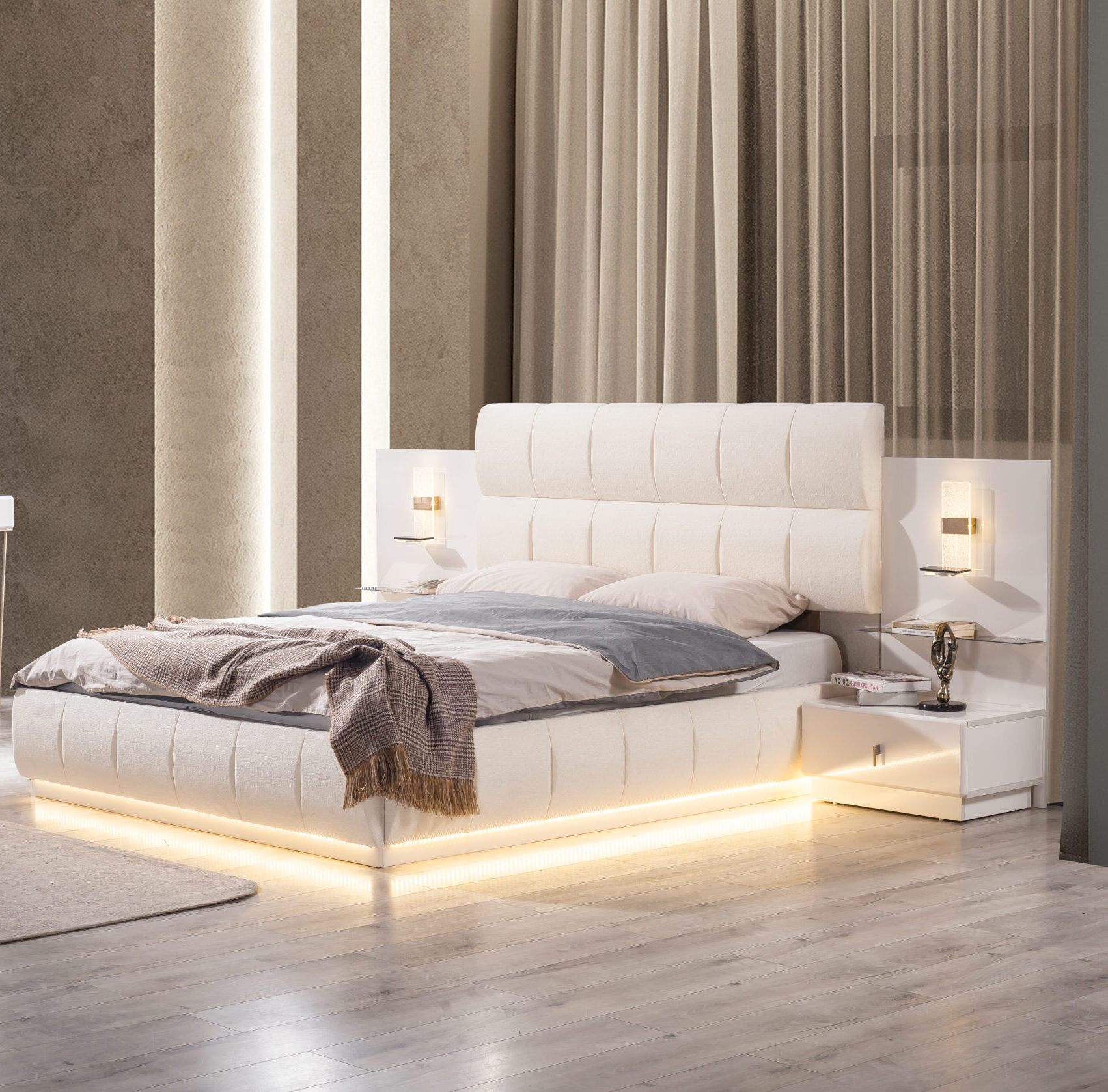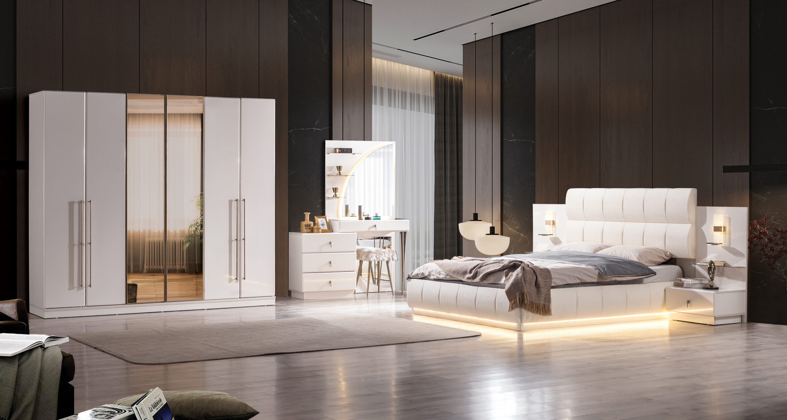 Yeni nesil yaşam alanları için özel olarak tasarlanan bu modern yatak odası takımı, şıklığı ve konforu bir arada sunuyor. Zenovia Home güvencesiyle üretilen takım, estetik gardırop, geniş depolama alanına sahip şifonyer, zarif komodinler ve ergonomik yatak ile tam bir bütünlük sağlıyor.