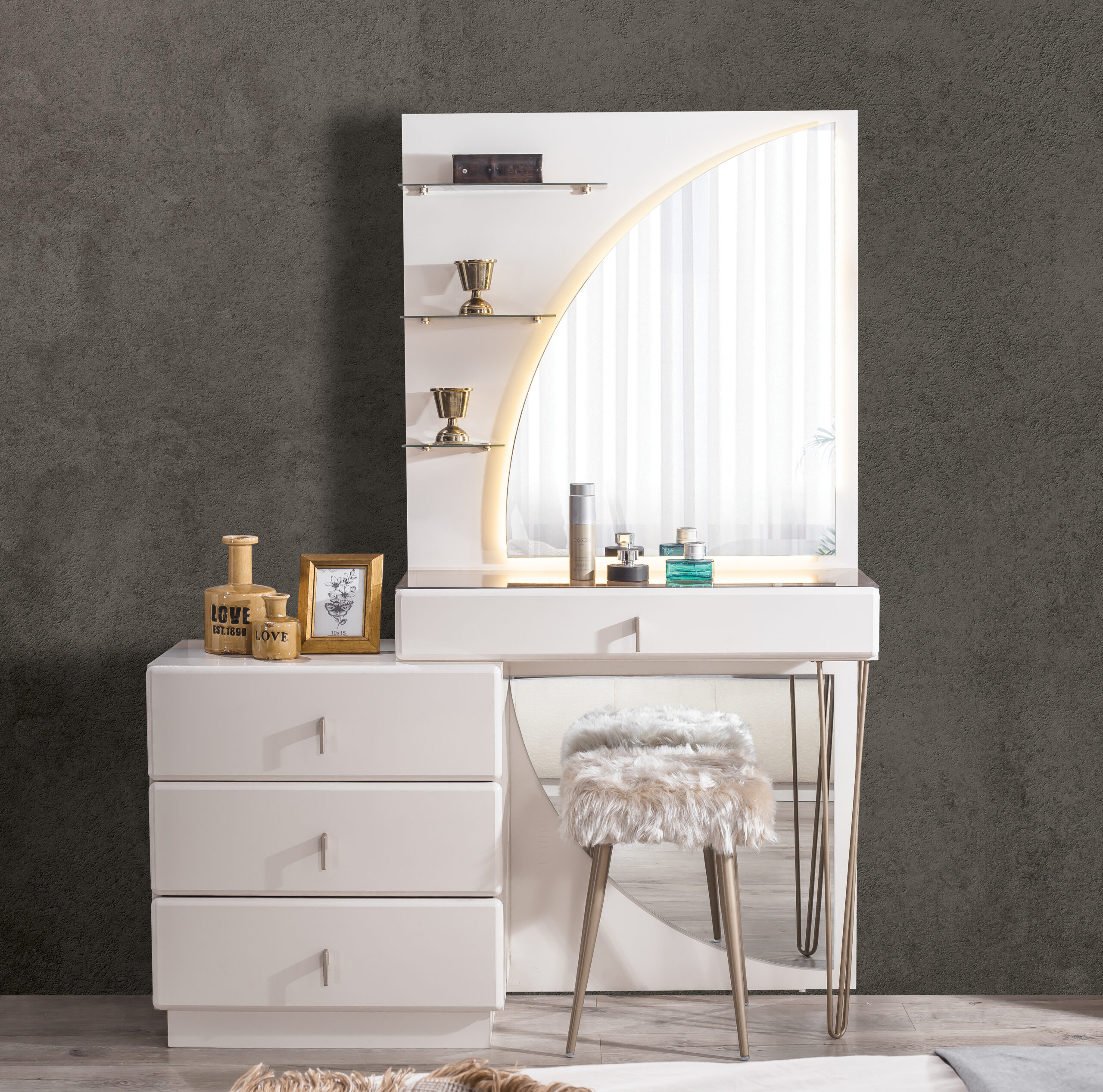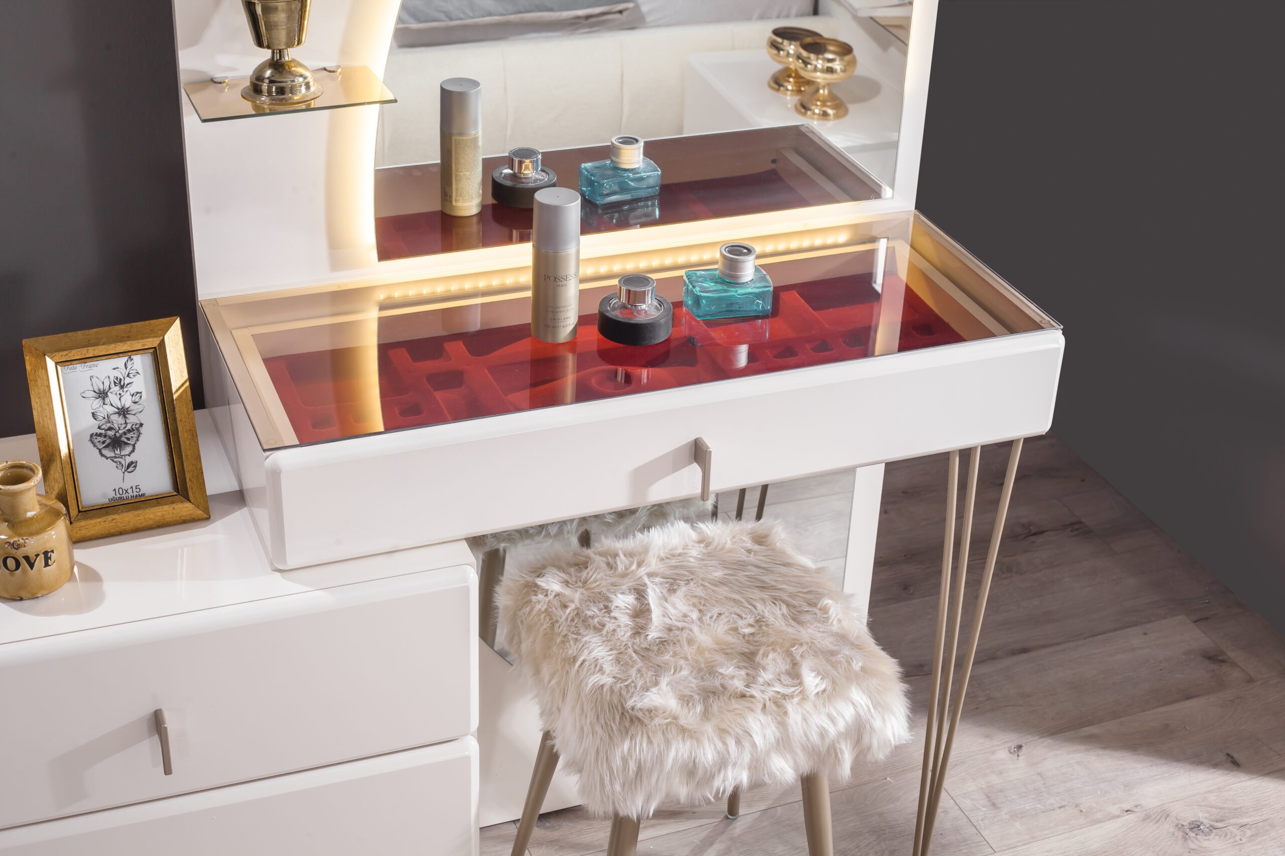 | Takım İçeriği | 1 adet gardırop, 1 adet karyola ve başlığı, 2 adet komodin, 1 adet şifonyer ve aynası , 1 adet puf dan oluşmaktadır |
