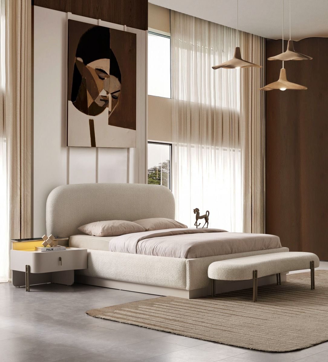 Yeni nesil yaşam alanları için özel olarak tasarlanan bu modern yatak odası takımı, şıklığı ve konforu bir arada sunuyor. Zenovia Home güvencesiyle üretilen takım, estetik gardırop, geniş depolama alanına sahip şifonyer, zarif komodinler ve ergonomik yatak ile tam bir bütünlük sağlıyor.